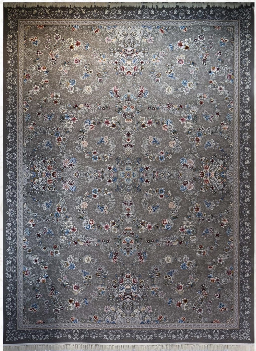 فرش ۷۰۰ شانه ۹ متری کاشان رنگ نقره ای طرح افشان رها khan